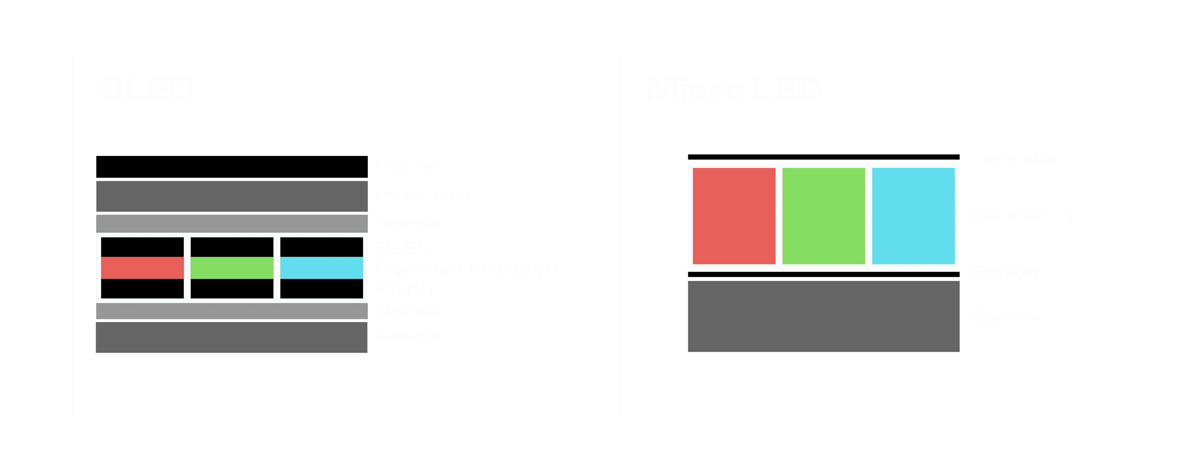 以 LED 做为显示画素,,可让 LED 的发光效率发挥到极致,,,,从而让显示器具备优异的亮度表现,,不论是在户外或室内,,均具备出众的显示效果。。。同时,,,,与使用有机材料的 OLED 相比,,LED 具备更稳定、、、、寿命更长的特性,,,,不仅不会有画面烙印问题,,,而且更不容易出现故障、、、坏点。。。。