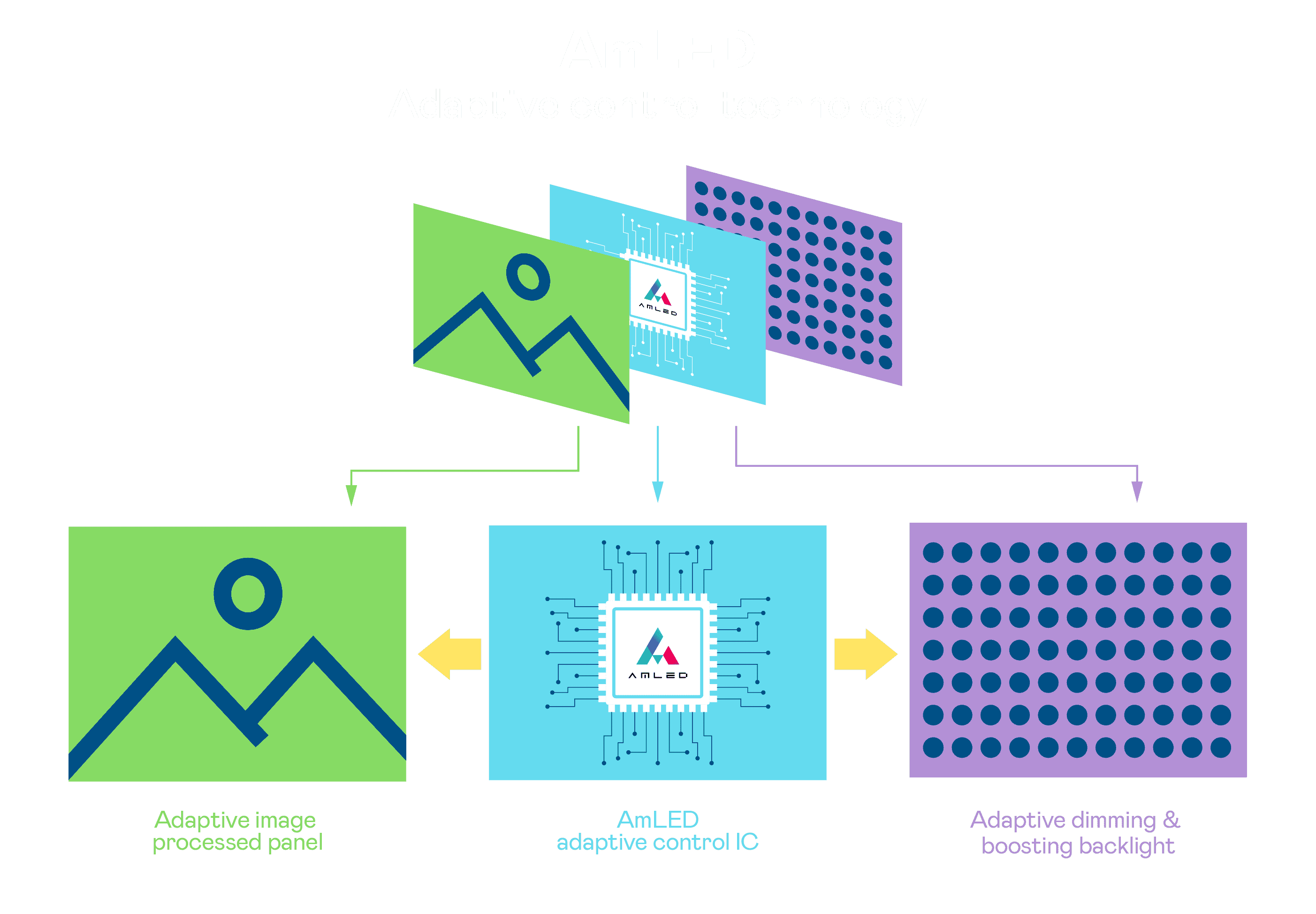 透过动态影像处理和 Mini LED 背光模组的动态对比及峰值亮度调变,,,AmLED 显示技术精准细致的局部调光效果达到超过 1,000 nits 的超高亮度表现,,亮部更明亮、、、暗处更深邃,,,呈现真实黑色中的亮度以及平滑灰阶,,,打造出具层次分明的精致光影细节。。